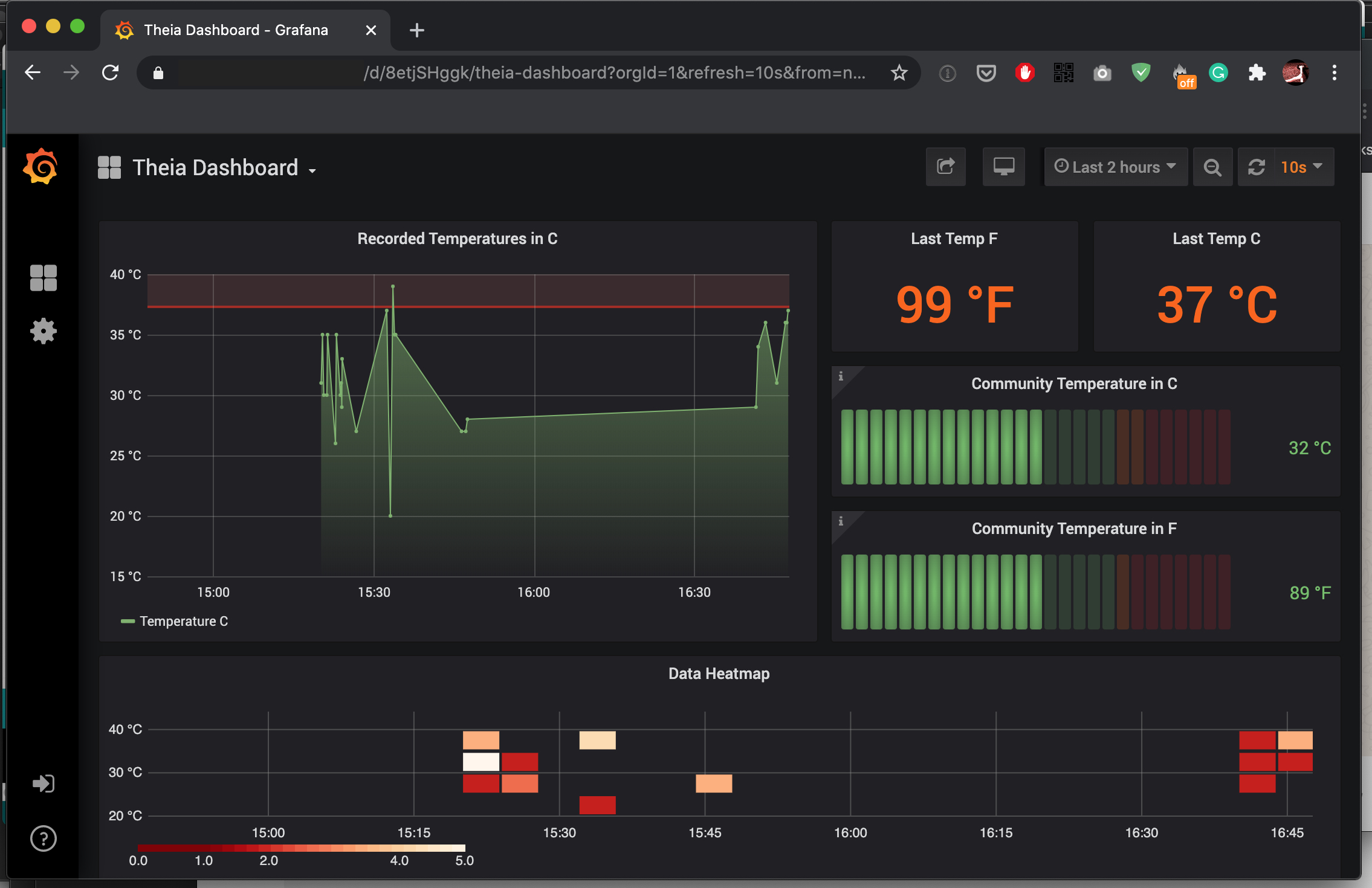 The Theia Hub listens for data transmissions in the particular, unlicensed, LoRa radio spectrum in each location and writes anonymous data points to a self-hosted InfluxDB database. The Hub interprets the data (currently limited in V1 to simple mean average calculations) and served by a Grafana self-hosted web front-end.