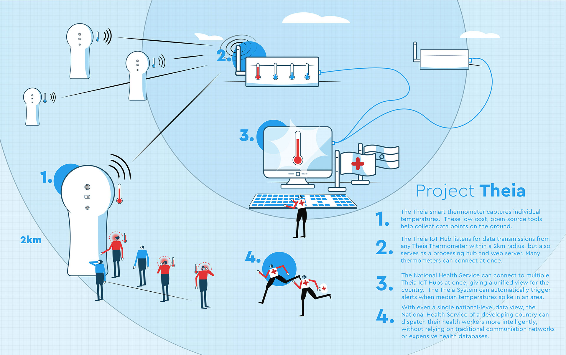 To address this, Theia collects real-time, on-the-ground contactless body temperature information. It sends the data to independent self-hosting data collection Hubs using ultra-long-distance IoT radios. The collected data is interpreted, analyzed, and served by the Hub (or multiple hubs), giving countries a functional, abet limited, real-time emergency health data layer to more intelligently deploy their health services more effectively than before.